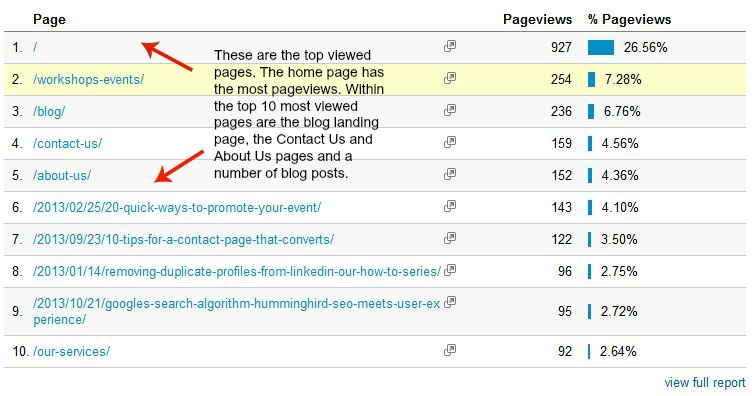 More than likely, the first entry (your top viewed page) shows a simple slash symbol (/) – that’s your Home page. Listed beneath, by number of visits, are the most visited pages in the time period specified. (Note that if you have more than 10 pages, there’s a “View full report” link to see more, but that’s a topic for another day.)