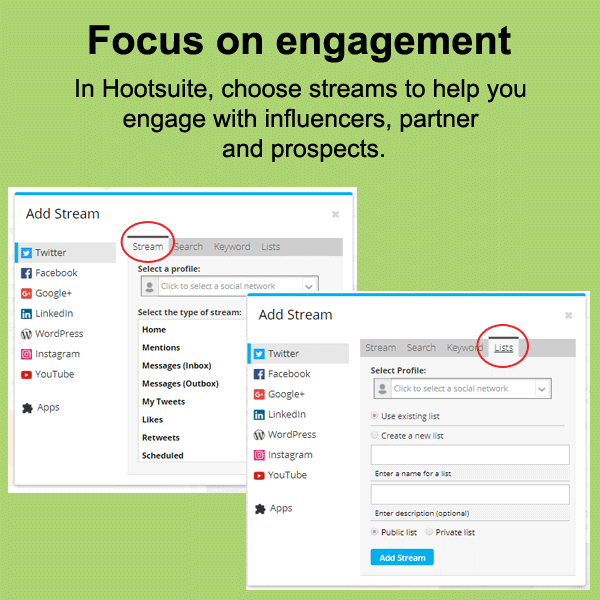 While the Twitter platform includes Notifications which alert you to engagement such as @mentions and new followers, Hootsuite offers a more intuitive functionality to view each type of engagement in its own stream. For example, a stream of new followers allows you to quickly identify those that are most relevant, enabling you to acknowledge and engage with them.