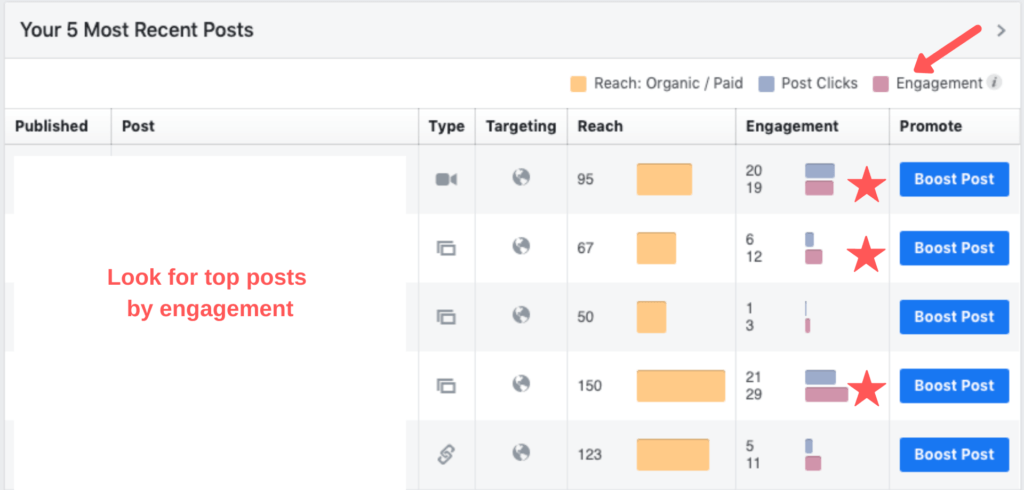 Facebook Insights – Look for top posts by engagement