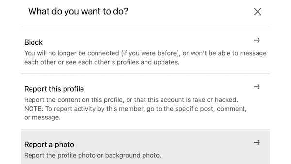 Blocking a connection is a stronger action that may occasionally become necessary (such as someone spamming your in-box with messages, misrepresenting themselves or posting inappropriate comments on your posts). Selecting the Report/Block menu item from their profile provides the following options: